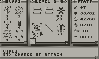 Binary Battle is a novel take on the dungeon crawler genre. It was inspired by GEOS on C64 and the PC game Folder Dungeon.
