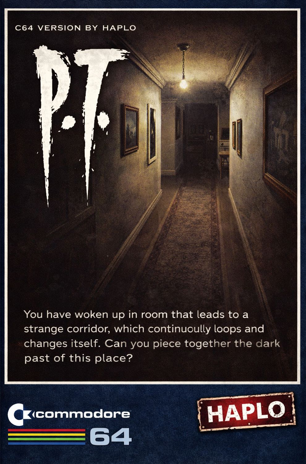 The C64 version of P.T. was heavily inspired by the Gameboy Colour version. It is compatible with PAL (recommended) and NTSC machines.